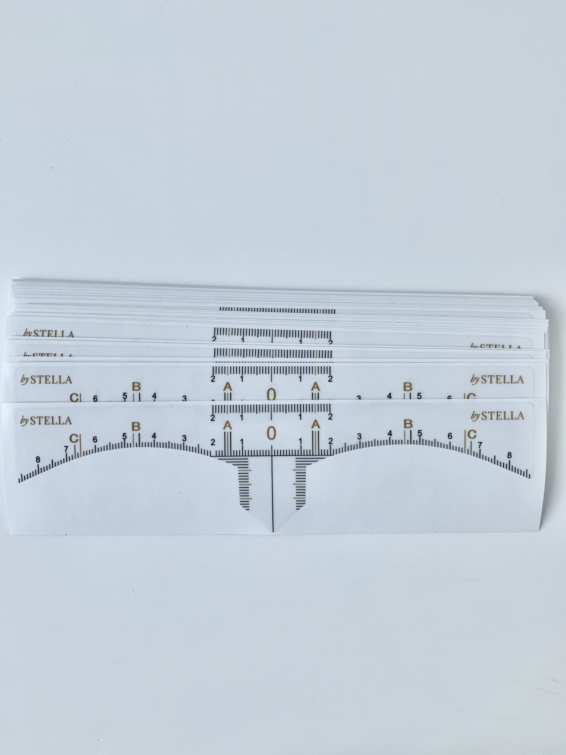 The measurements on this sticker are derived from golden mean proportions and work well on any face shape. This ruler has a combination of horizontal and vertical measurements on the inside and outside of the eyebrows giving the technician more precision and balance.